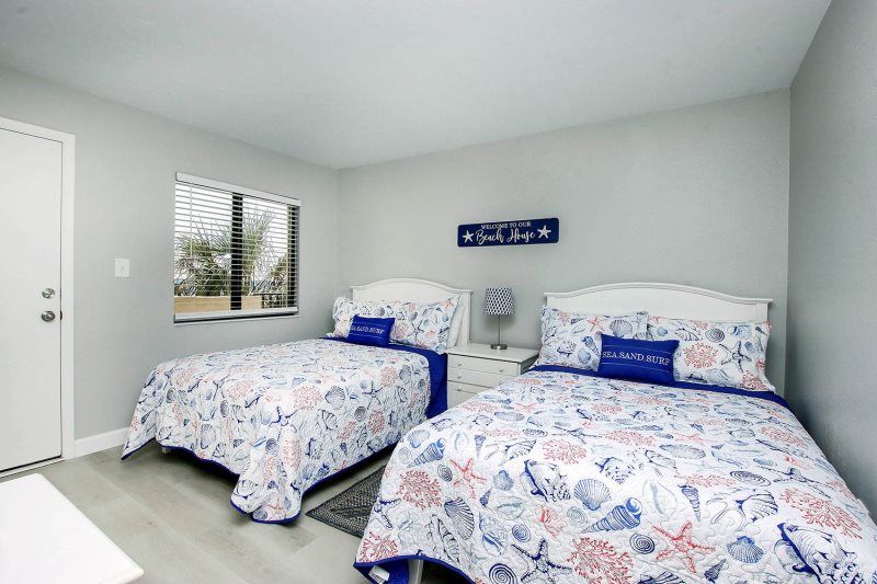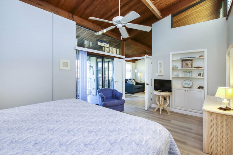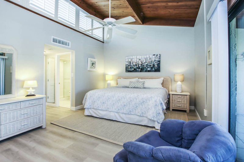 The master bedroom suite has a luxurious King bed with an en-suite bathroom featuring a beautifully tiled, full walk-in shower. Step out from your sanctuary directly into the beautiful setting afforded from the lanai, including stunning views of the Gulf, beach and pool – which happens to be one of the largest heated pools on Sanibel Island. The master suite affords you a spacious closet, as well as dresser and drawers for all of your clothing.
