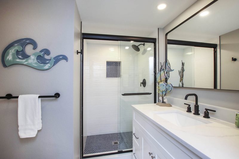 Your friends or family will enjoy their own spacious retreat in our beatifully appointed guest bedroom, featuring two full-size beds. The beach views are stunning from the guest bedroom, with long views down to the Sanibel lighthouse, as well as Ft. Myers Beach. The guest bathroom also features a spacious walk-in shower.